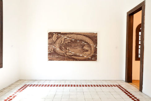 Rather than restoring or discarding these vestiges, the artist subjects them to a meticulous dissection, cutting them into extremely thin slices, as if seeking to reveal the invisible layers of history they contain. From this process of dismemberment a new body emerges: a mural depicting the figure of an ouroboros, the dragon that devours and renews itself, an ancestral symbol of the circularity of time, of life that feeds on its own death.